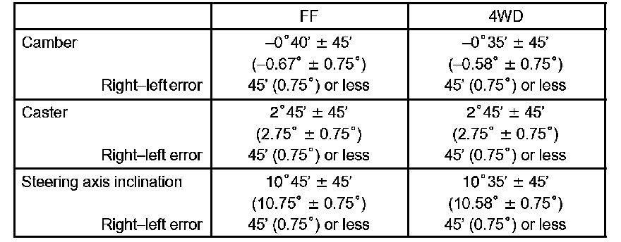 If the caster and steering axis inclination are not within the specified values after the camber has been correctly adjusted, recheck the suspension parts for damage and/or wear.