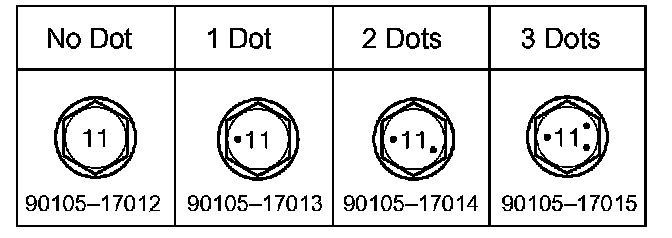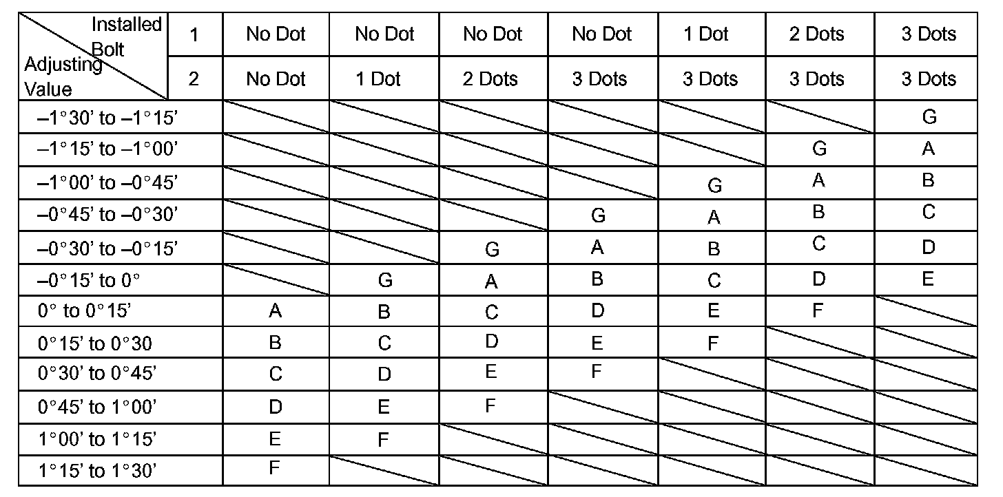 Check installed bolts combination. Select appropriate bolts from the table to adjust the camber to within the specified range.