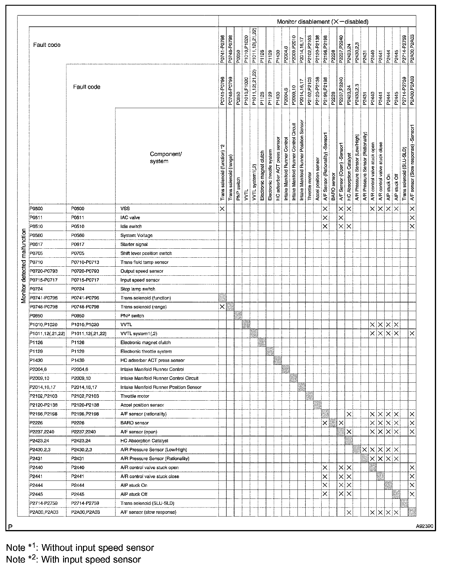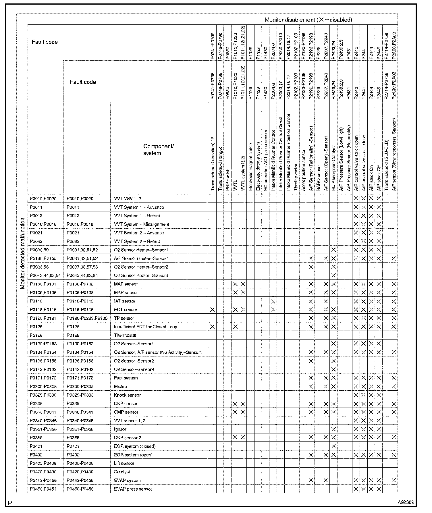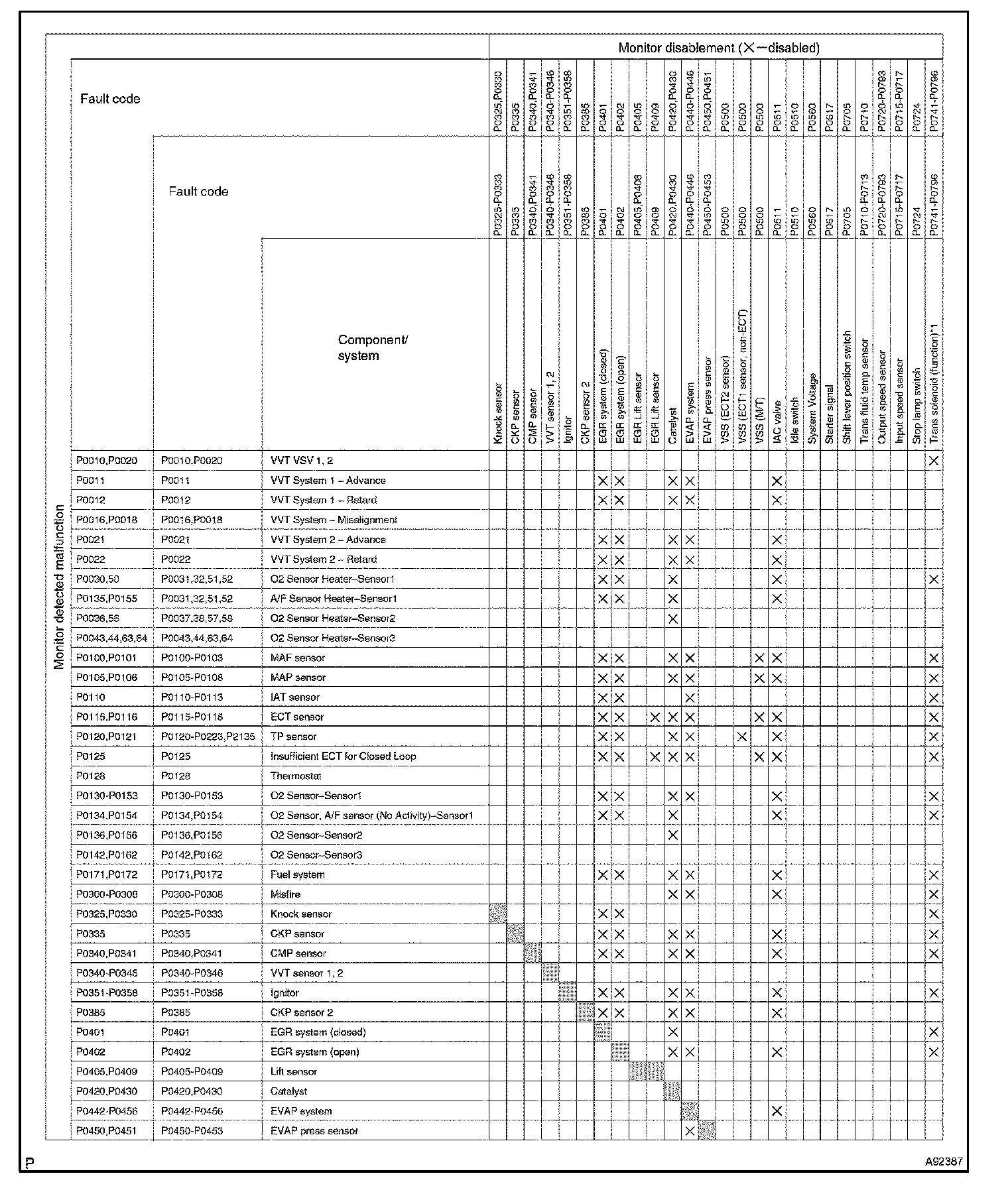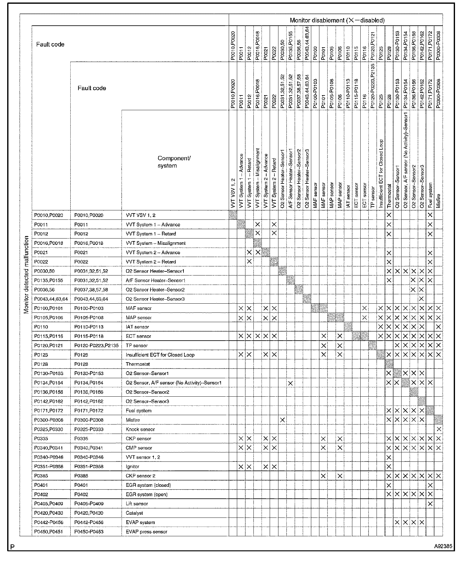 The table shows the ECM monitoring status for the components listed in the top of the table when the DTCs on the left of the table are set.