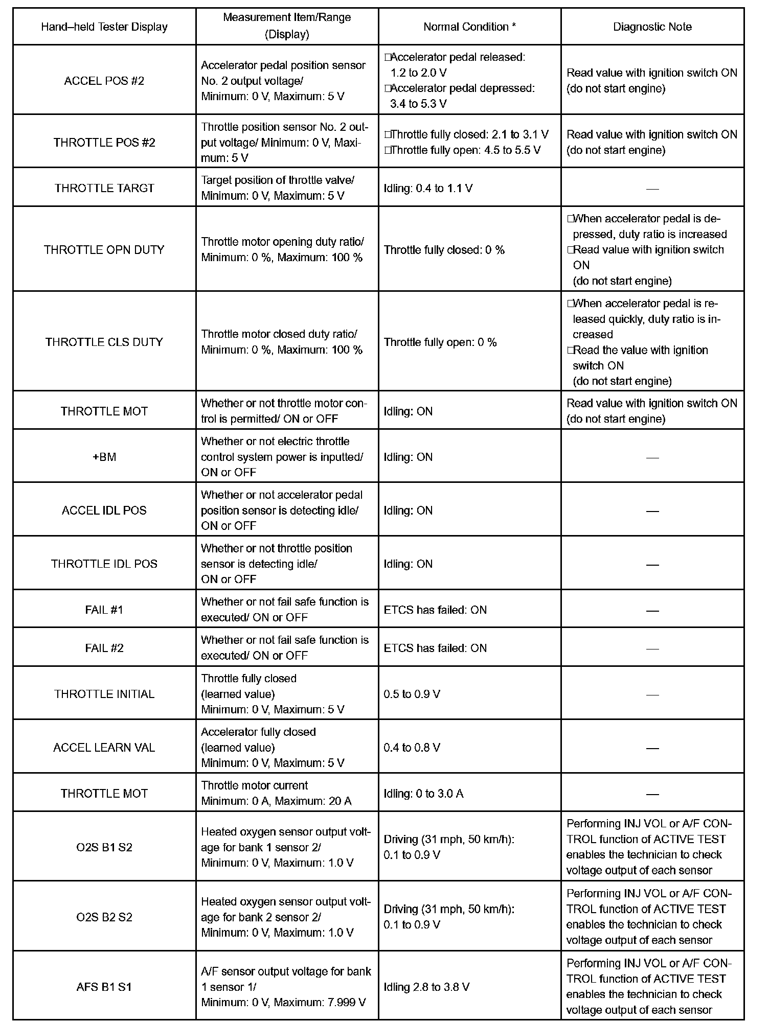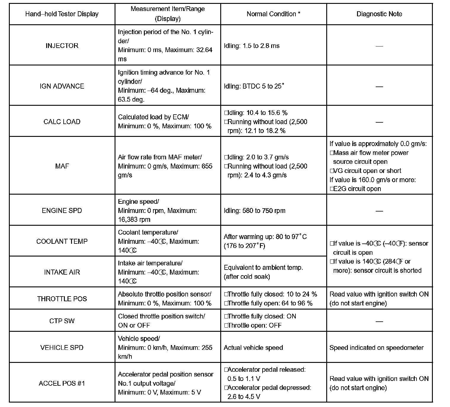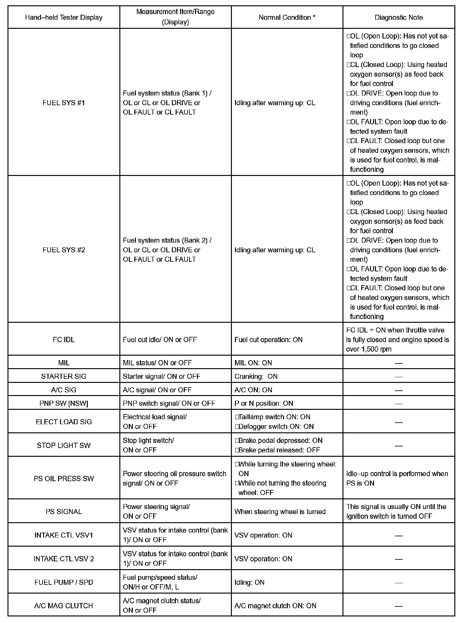 HINT: *: If no conditions are specifically stated for "Idling", the shift lever is in the N or P position, the A/C switch is OFF and all accessory switches are OFF.
