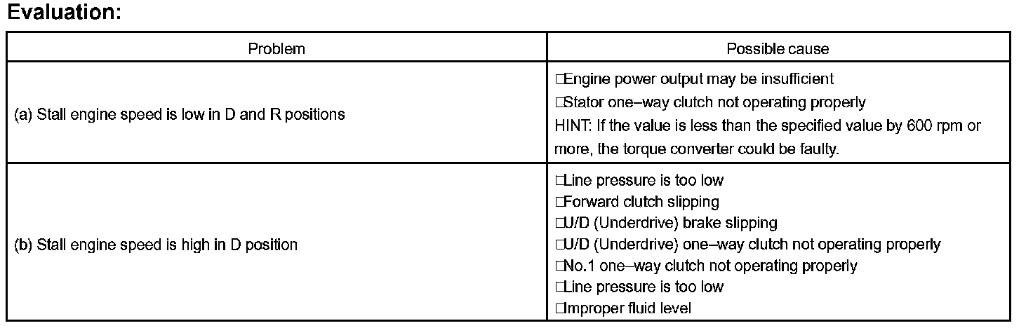 The object of this test is to check the overall performance of the transaxle and engine by measuring the stall speeds in the D positions.