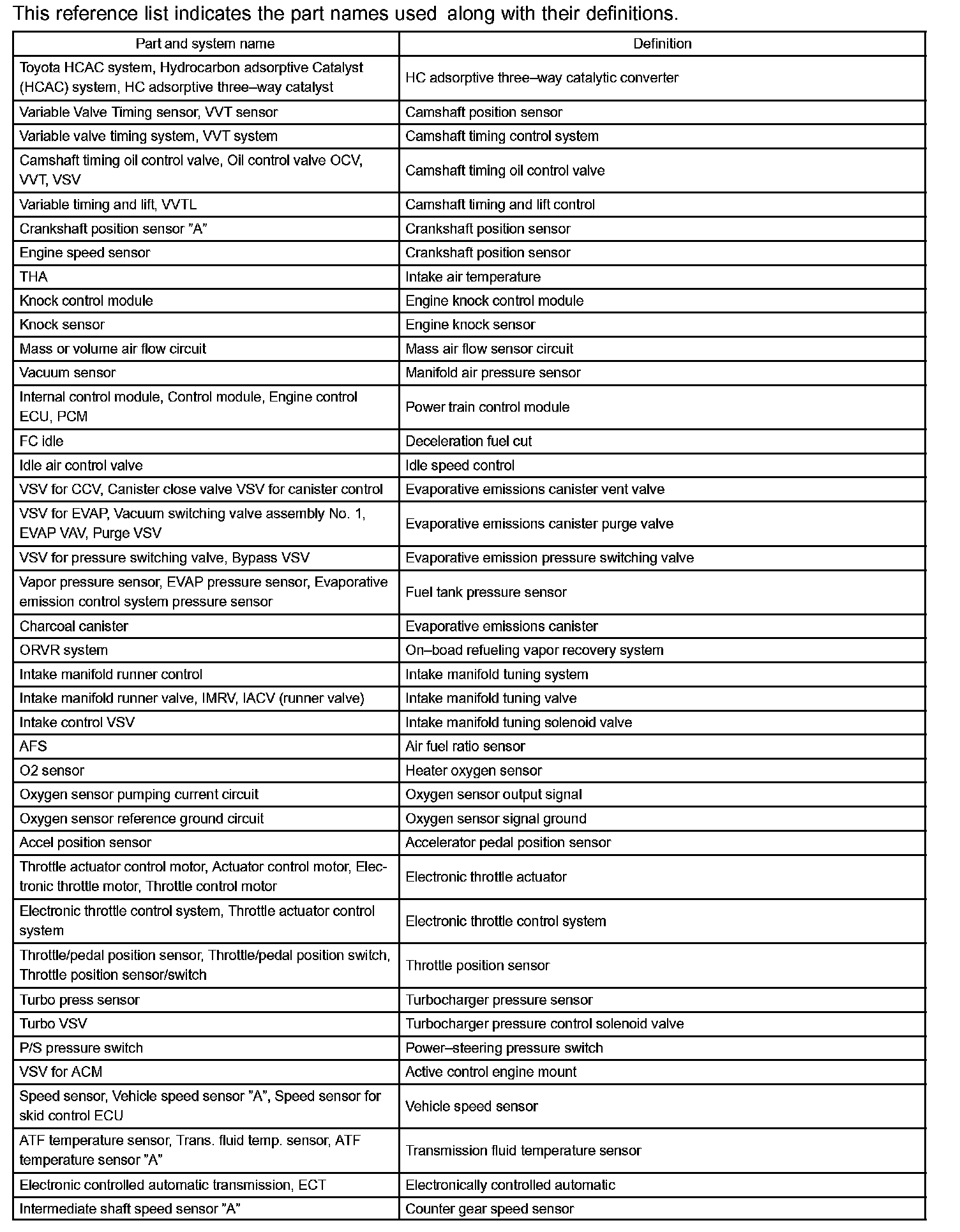 Toyota Part And System Name List Part 1: