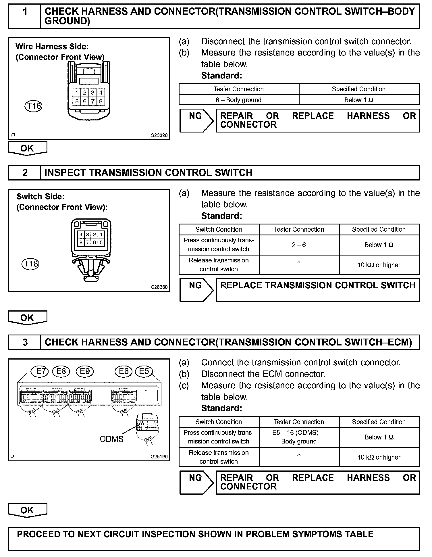 The O/D main switch (transmission control switch) is a momentary type switch. When pressing the O/D main switch, the O/D OFF indicator light lights up and the ECM prohibits shifting into O/D, and when pressing it once again, the O/D OFF indicator light goes off and the ECM allows shifting into O/D. Turning the IG switch OFF will reset the O/D OFF indicator light.
