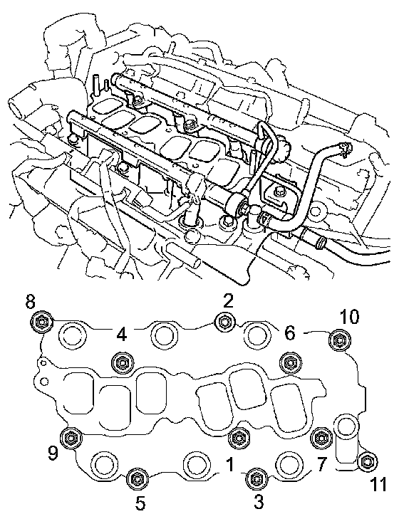 Install the intake manifold with the 9 bolts, 2 nuts and 2 washers. Uniformly tighten the bolts and nuts in the sequence shown in the illustration.