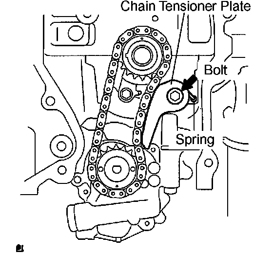 f. Insert the damper spring into the adjusting hole, and install the chain tensioner plate with the nut.