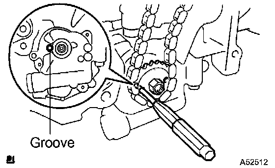 a. Turn the crankshaft counterclockwise 90°, and align an adjusting hole of the oil pump driven sprocket with the groove of the oil pump.