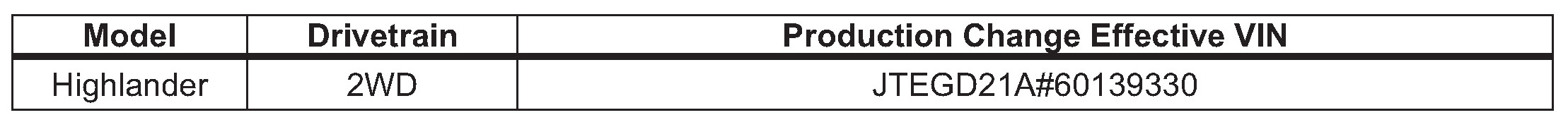 - 2005 - 2006 model year Highlander vehicles equipped with 2AZ-FE engine and produced BEFORE the Production Change Effective VINs shown below.