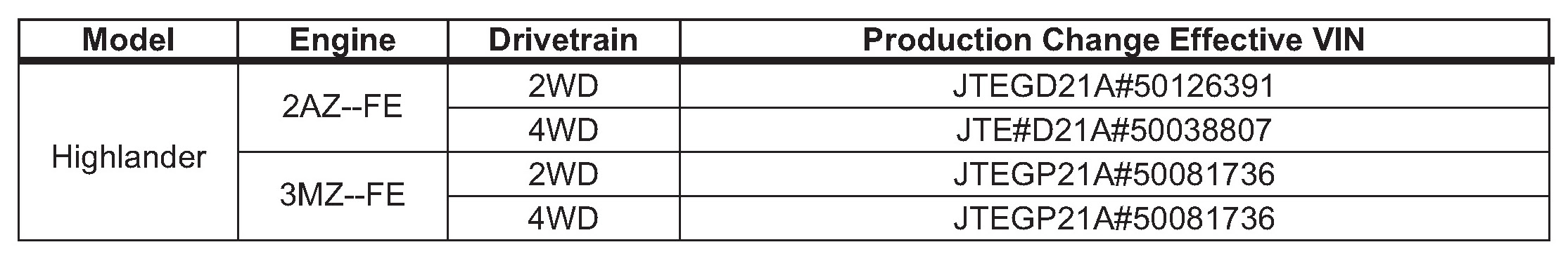 - 2004 - 2005 model year Highlander vehicles produced BEFORE the Production Change Effective VINs shown below.