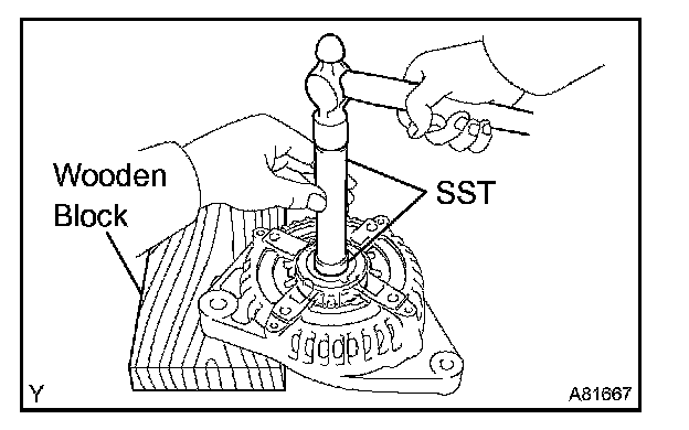 b. Using SST and a wooden block, tap out the bearing.