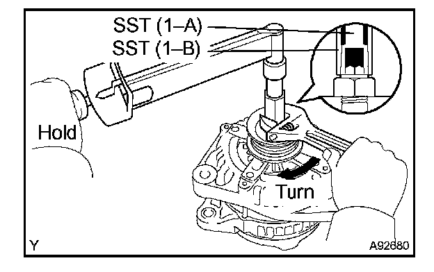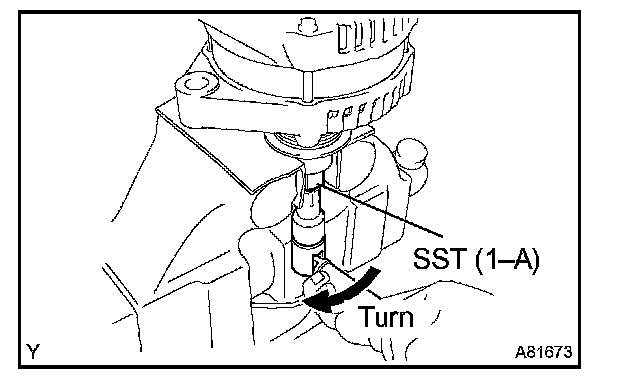 d. To loosen the pulley nut, turn SST (1-A) in the direction shown in the illustration.