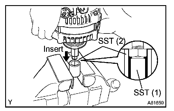d. Insert SST (1-A) and (B) into SST (2), and attach the generator pulley nut to SST (2)