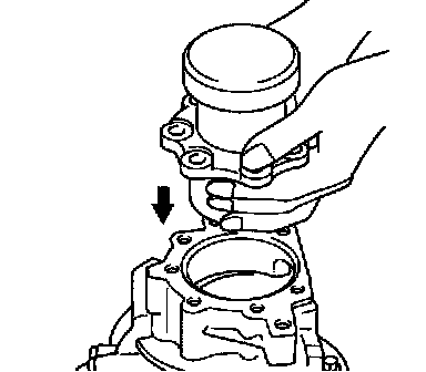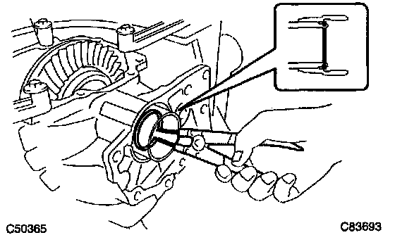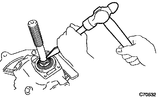 b. Using a screwdriver and a hammer, make a clearance between the right bearing retainer and the transfer case.