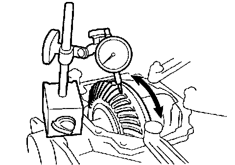 a. Set the dial gauge perpendicular to the ring gear face, fix the driven pinion, and check the backlash by moving the ring gear.