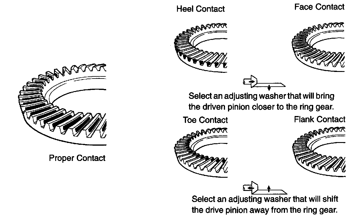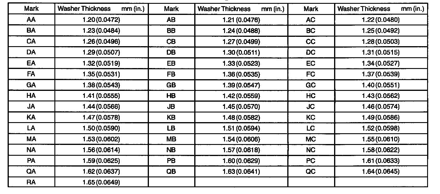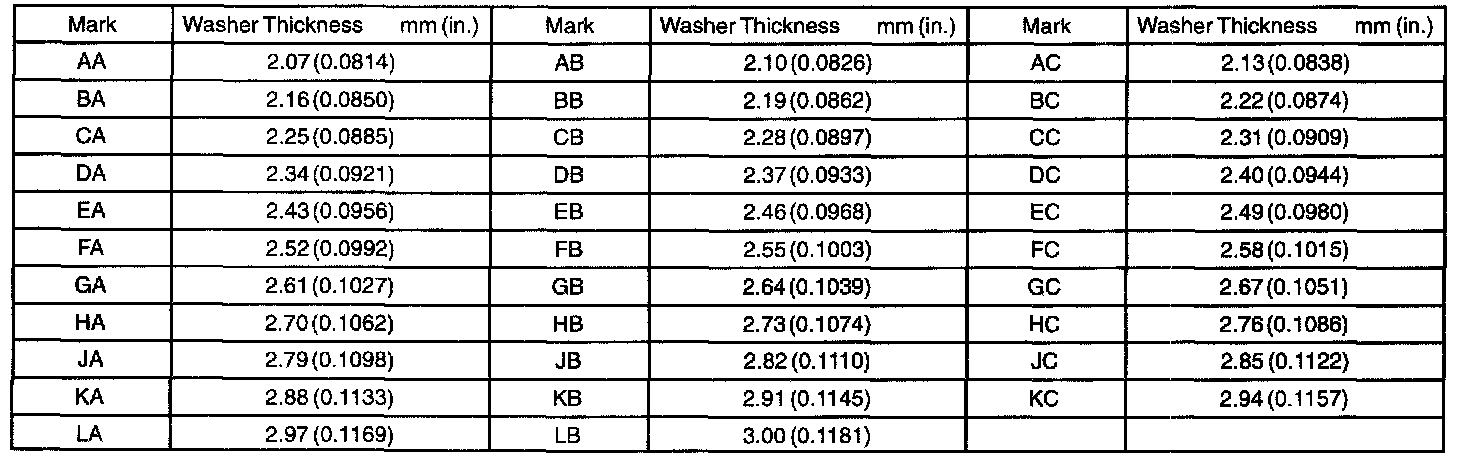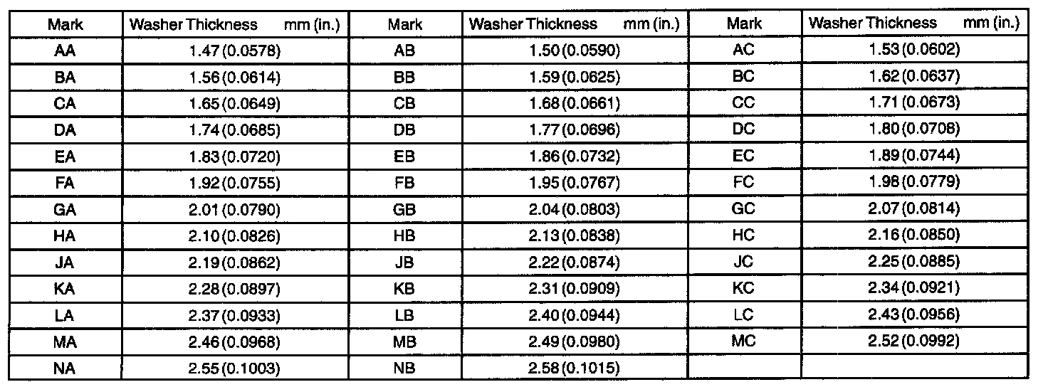 c. In the case of faulty tooth contact, select a washer for the driven pinion bearing front side from the following table and reinstall it.