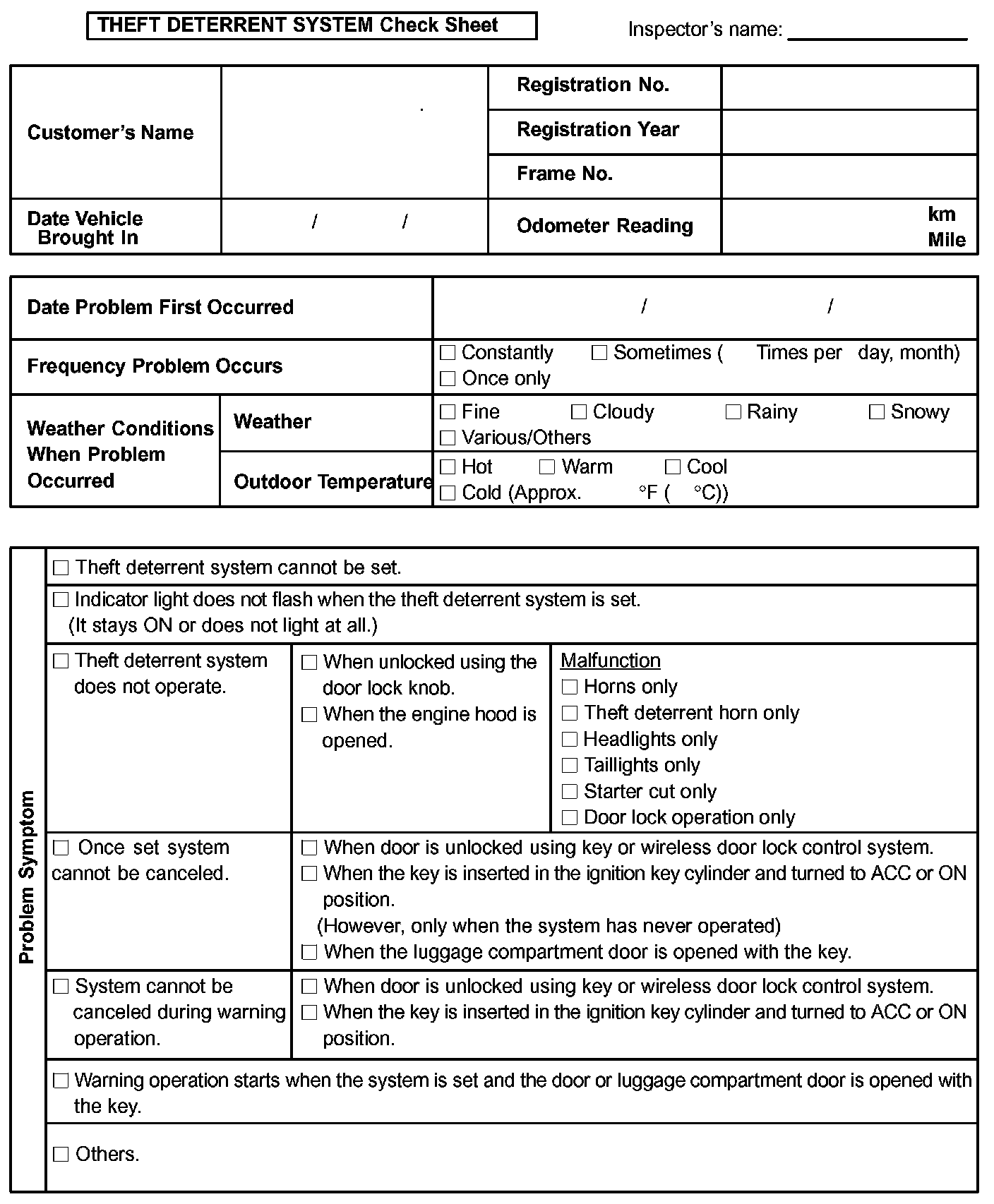 Theft Deterrent System Check Sheet: