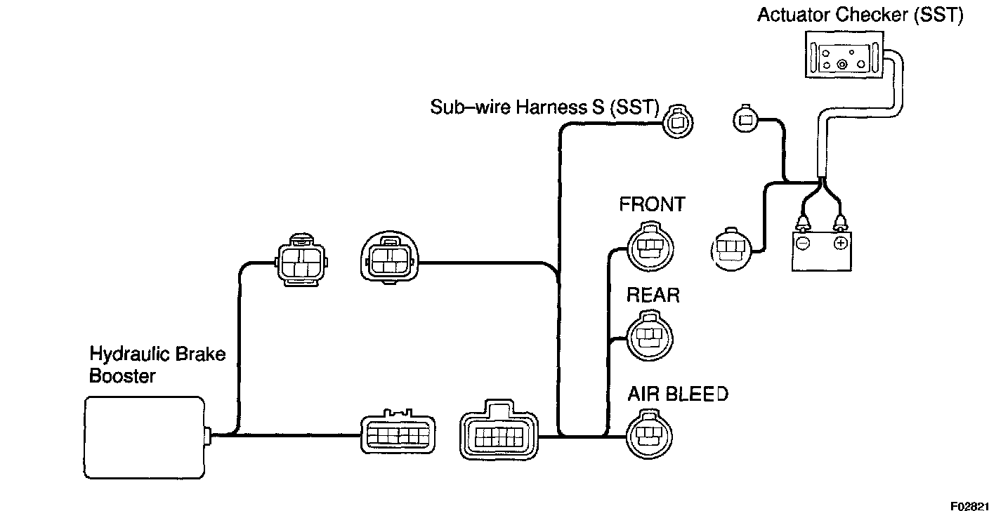 c. Connect the actuator checker (SST) to the hydraulic brake booster side wire harness via the sub-wire harness S (SST), as shown in the following chart.