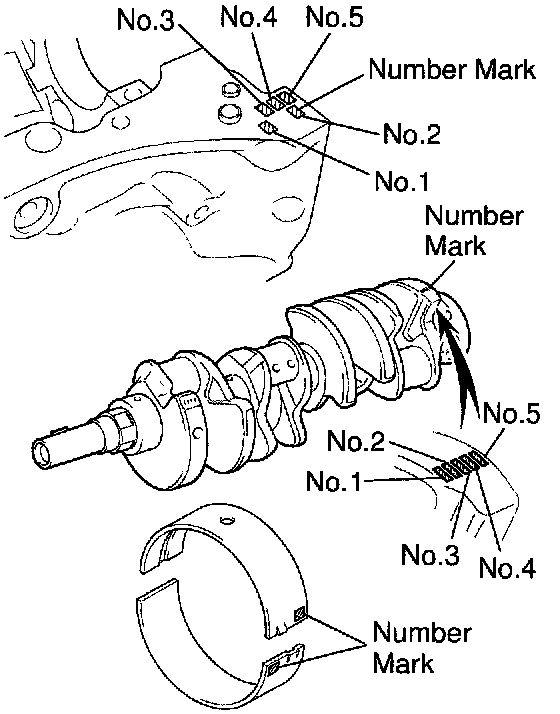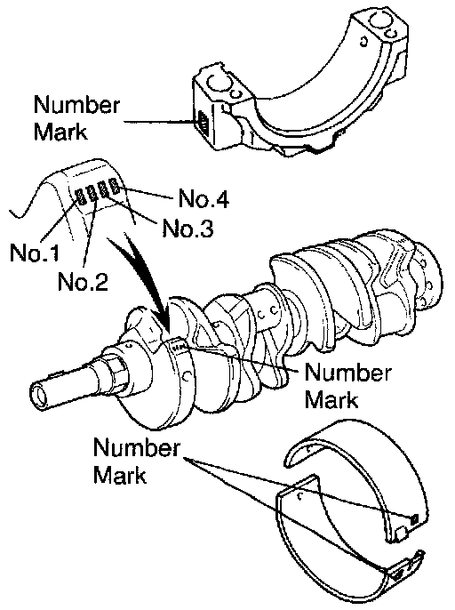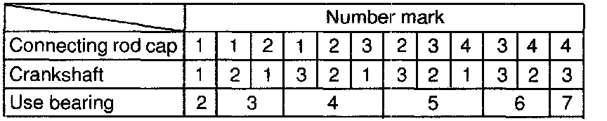 HINT: If using a standard bearing, replace it with the one having the same number. If the number of the bearing cannot be determined, sum up the numbers imprinted on the connecting rod cap and the crankshaft, then select the one with the same number as the total. There are 6 sizes of standard bearings, marked "2", "3", "4", "5", "6" and "7".