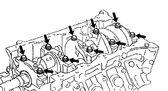 a. Evenly loosen and remove the 10 main bearing cap bolts a little at time for several times, in the sequence shown.