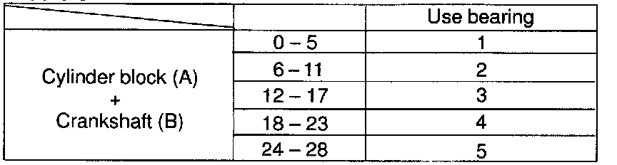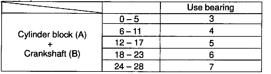 HINT: If using a standard bearing, replace it with the one having the same number. If the number of the bearing cannot be determined, sum up the numbers imprinted on the cylinder block and the crankshaft, then refer to the table below for the appropriate bearing number. There are 5 sizes of the standard bearings. For No.1 and No.5 position bearings, use bearings marked "3", "4", "5", "6" and "7". For others position bearings, use bearings marked "1", "2", "3", "4" and "5".