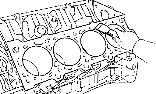 a. Using a gasket scraper, remove all the gasket material from the top surface of the cylinder block. Using a soft brush and solvent, thoroughly clean the cylinder block.