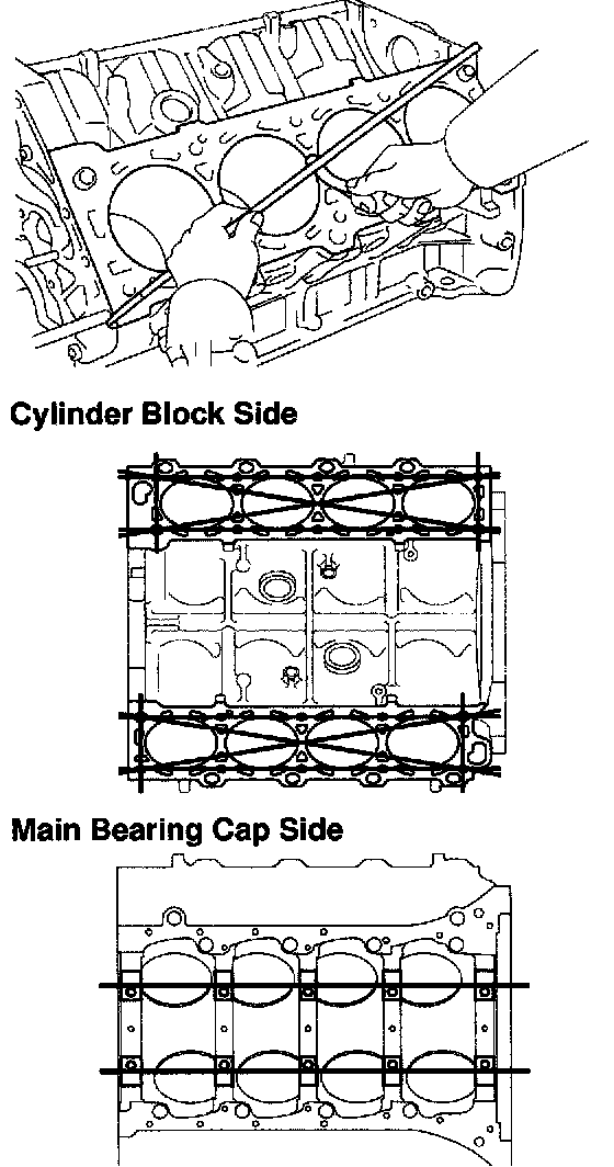 a. Inspect for flatness. Using a precision straight edge and a feeler gauge, measure the surfaces contacting the cylinder head and main bearing cap for a warp.