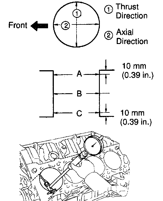 Using a cylinder gauge, measure the cylinder bore diameter at positions A, B and C in the thrust and axial directions.