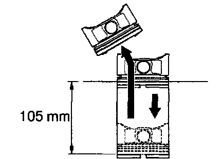 (2) Using a piston, push the piston ring to a little beyond the bottom of the ring travel, 105 mm (4.13 inch) from the top of the cylinder block.