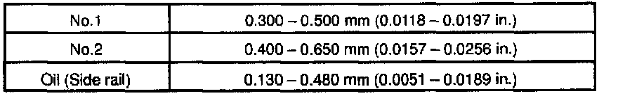 If the end gap is greater than the maximum, replace the piston ring. If the end gap is greater than the maximum, even with a new piston ring, rebore all the 8 cylinders or replace the cylinder block.