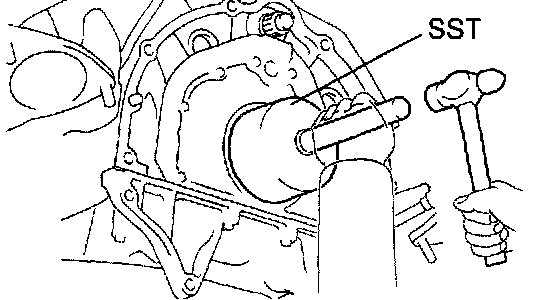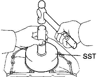 4. Using SST and a hammer, tap in the oil seal until its surface is flush with the rear oil seal retainer edge.