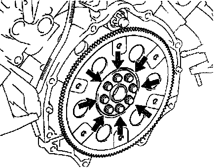 c. Hold the crankshaft pulley bolt with a wrench, and remove the 6 bolts.