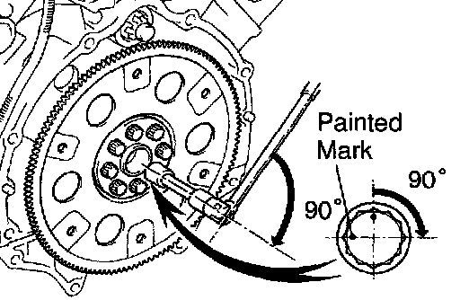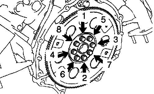 b. Hold the crankshaft pulley bolt with a wrench, and install the 6 bolts evenly.