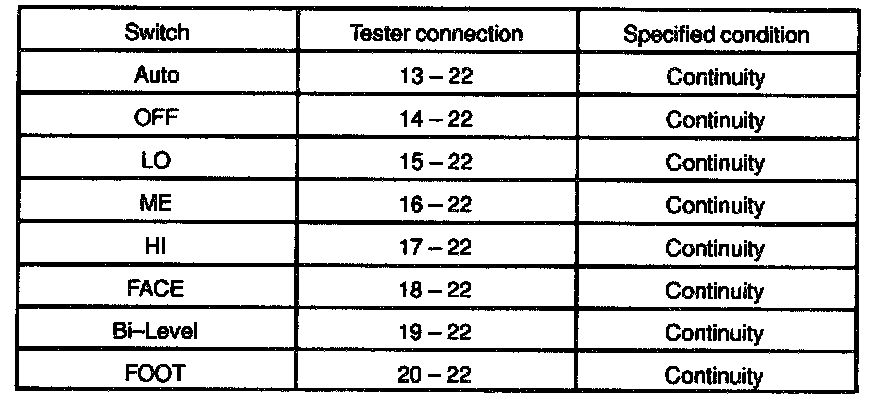 b. Gradually move the temperature control lever from "COOL" side to "WARM" side then check that the resistance between terminals 11 and 12 increase from 0 to 3.0 kohm.