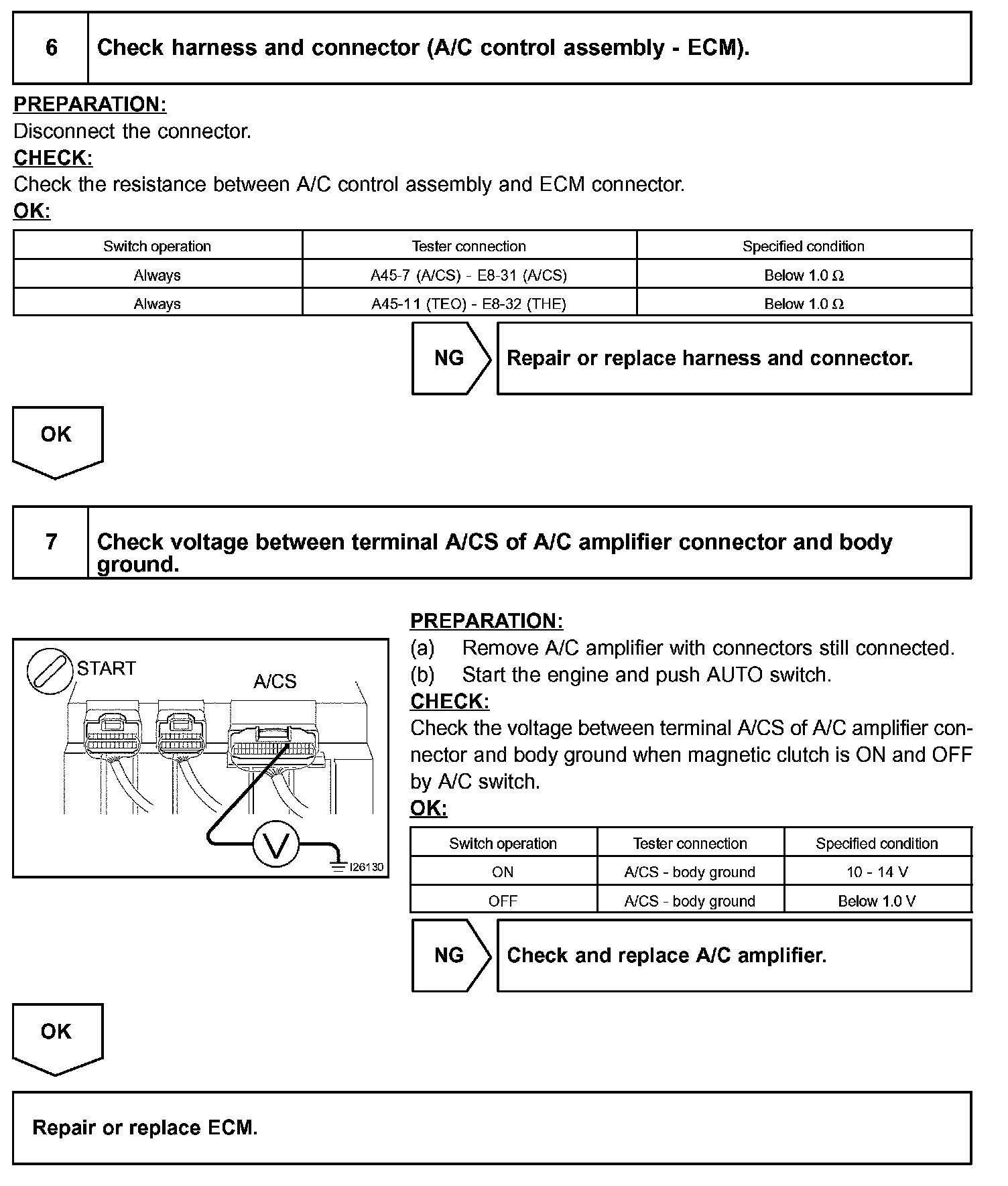 The A/C amplifier outputs the magnetic clutch ON signal from terminal A/CS to the ECM. When the ECM receives this signal, it sends a signal from terminal ACMG and switches the A/C magnetic clutch relay ON, thus turning on the A/C magnetic clutch.
