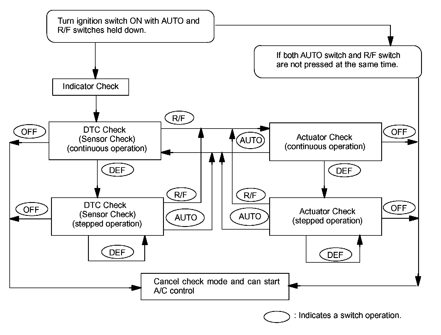 By operating each of the A/C control switches as shown in the diagram, it is possible to enter the diagnosis check mode.