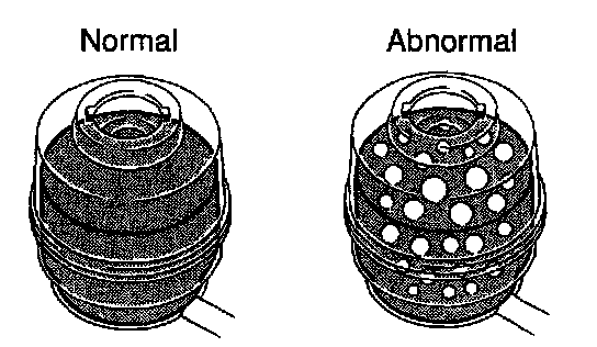 e. Check for foaming or emulsification. If there is foaming or emulsification, bleed power steering system.
