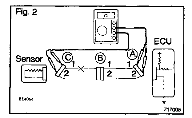 1. Disconnect connectors "A" and "C" and measure the resistance between them.