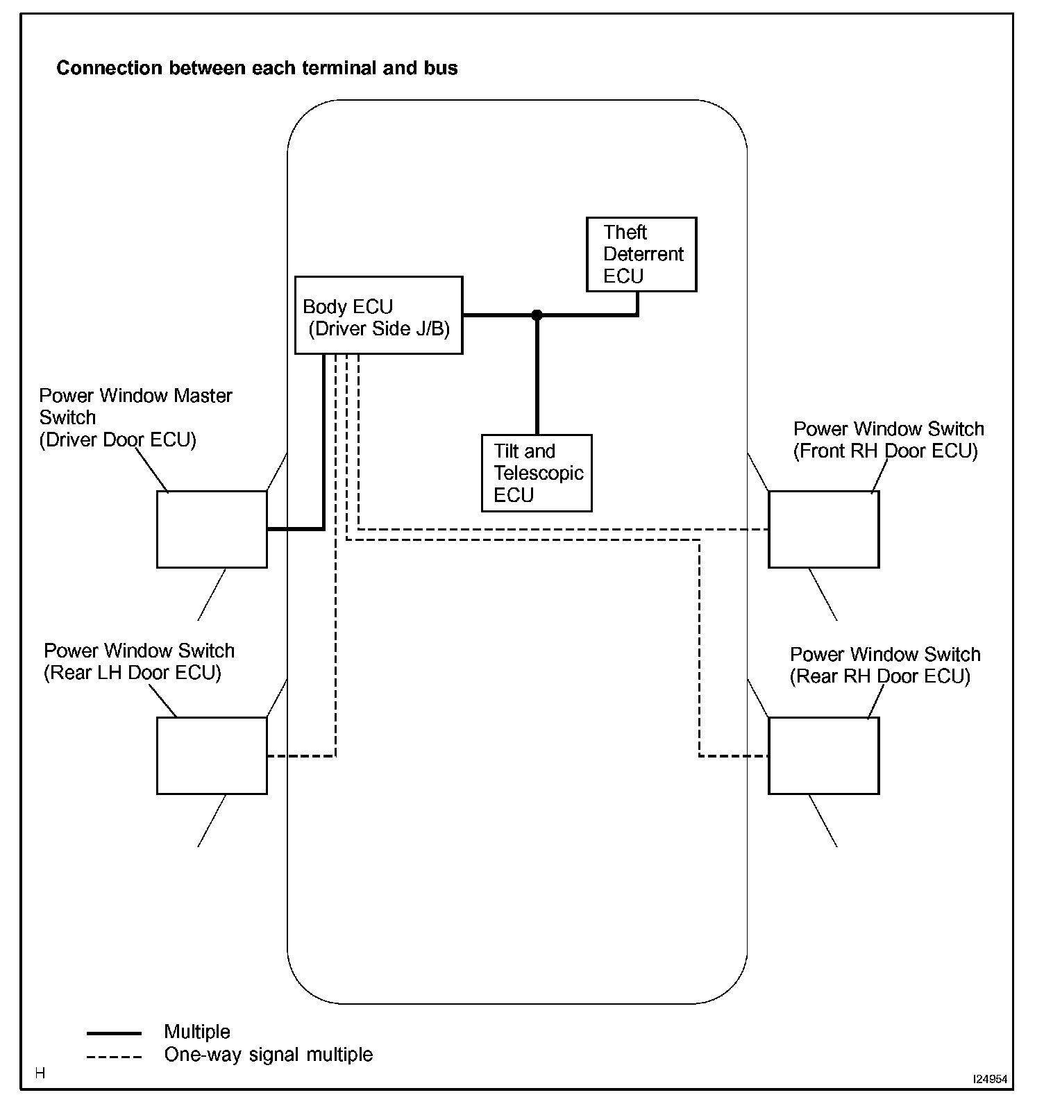 DIAGNOSIS SYSTEMa. As shown in the diagram, ECUs of this vehicle are connected each other by communication buses through which various signals are transmitted. These communication buses are diagnosed by the Body ECU. When the Body ECU detects a communication error between ECUs, or B+ short or GND short of a communication bus, a DTC is output and memorized. The Body ECU cannot diagnose accurately unless it can function normally. Therefore, first confirm the normal condition by performing a "BASIC INSPECTION" described later and then, troubleshoot against each DTC.