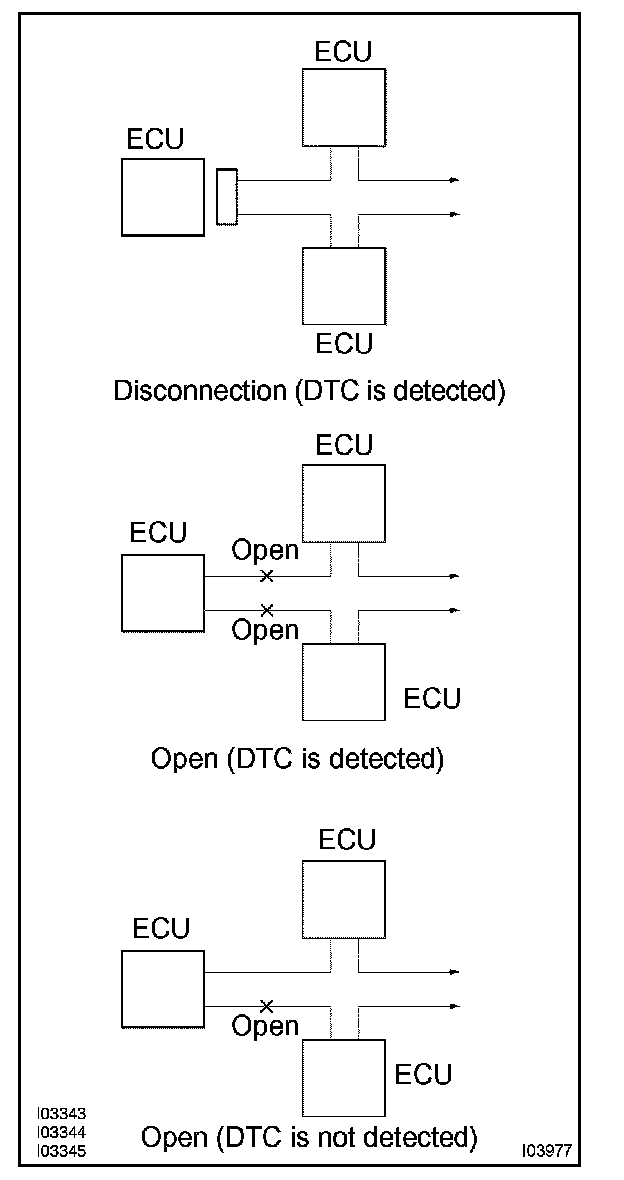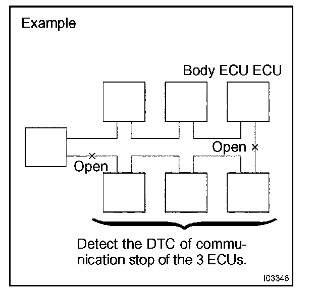b. If DTC of ECU communication stop is output, connectors may be disconnected, or communication buses may be open at 2 points. It will not become abnormal with only 1 communication bus open.