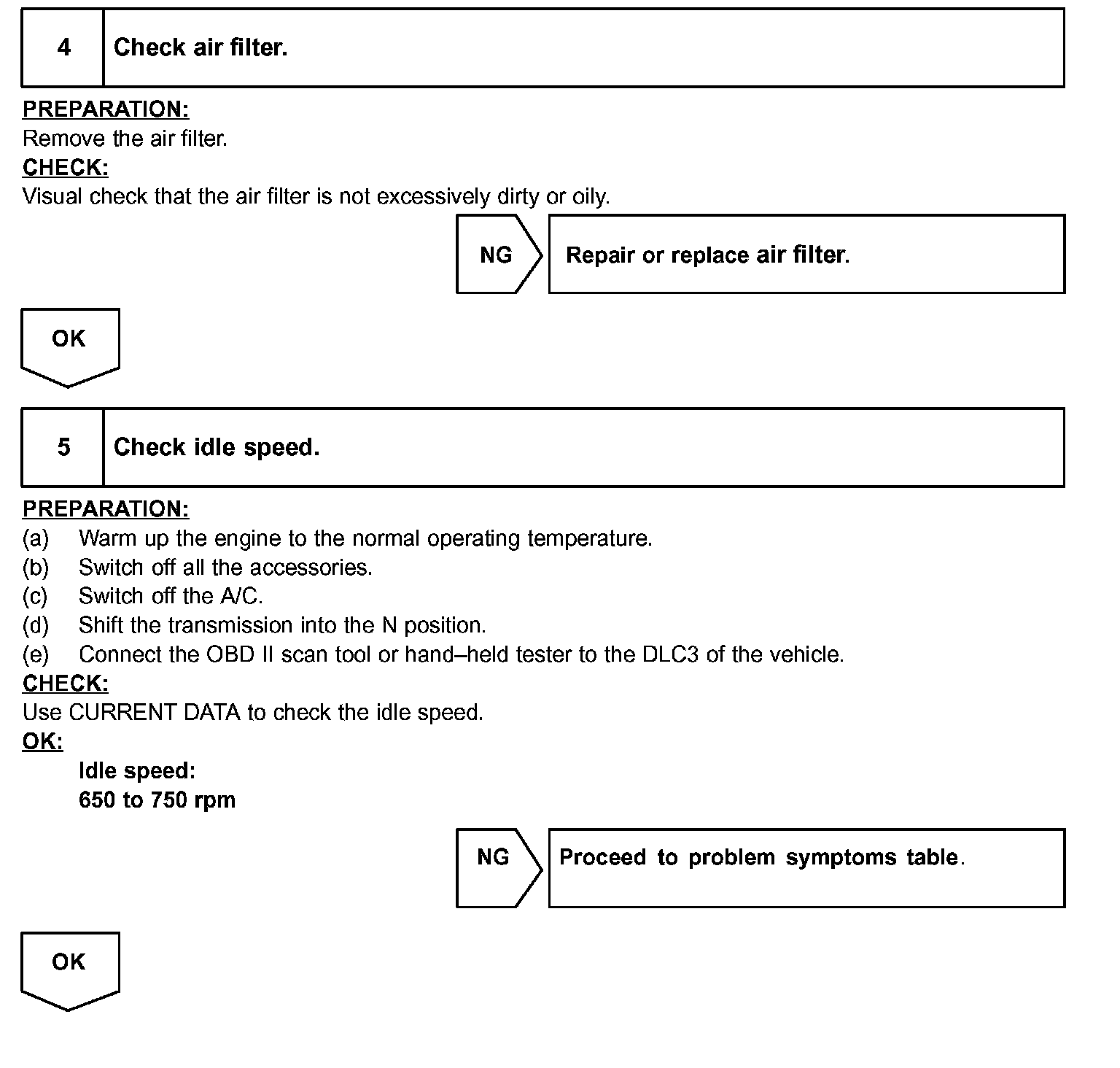 When the malfunction is not confirmed in the DTC check, troubleshooting should be carried out in all the possible circuits considered as causes of the problem. In many cases, by carrying out the basic engine check shown in the flowchart, the location causing the problem can be found quickly and efficiently. Therefore, using this check is essential in the engine troubleshooting.