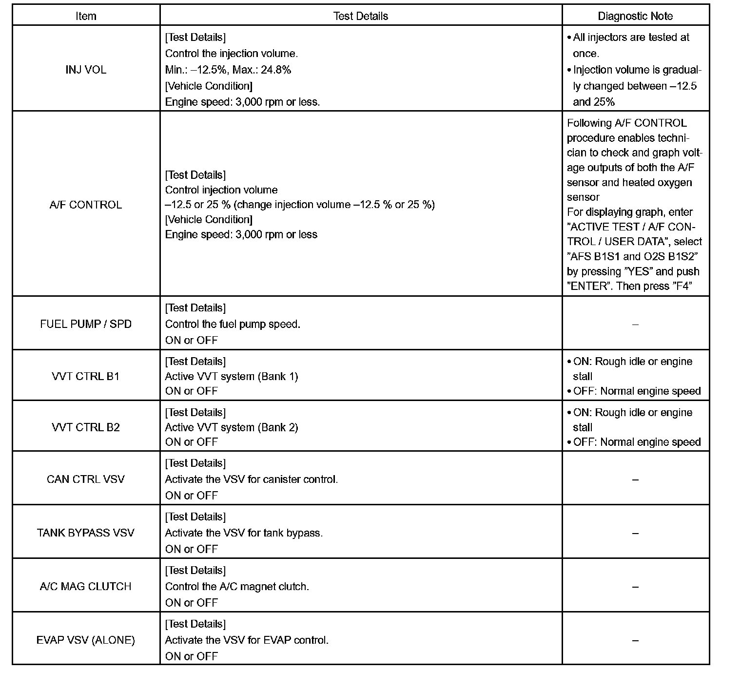 ACTIVE TESTHINT: Performing the ACTIVE TEST using the hand-held tester or the OBD II scan tool allows the relay, VSV, actuator and so on to operate without parts removal. Performing the ACTIVE TEST as a first step of troubleshooting is one method to shorten diagnostic time. It is possible to display the DATA LIST during the ACTIVE TEST.