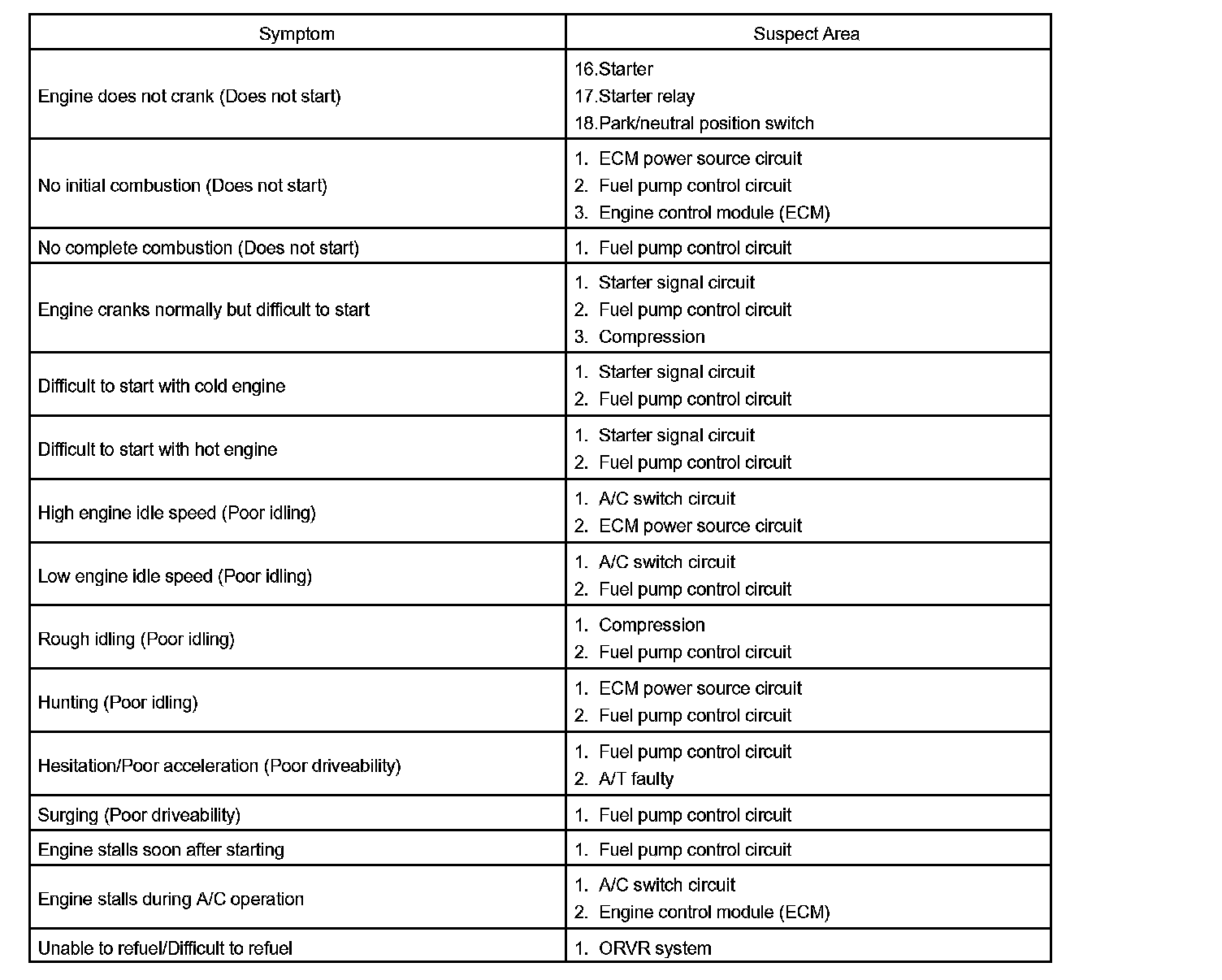 Problem Symptoms Table:
