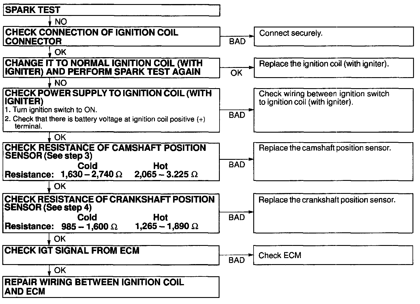 If the resistance is not as specified, replace the crankshaft position sensor.