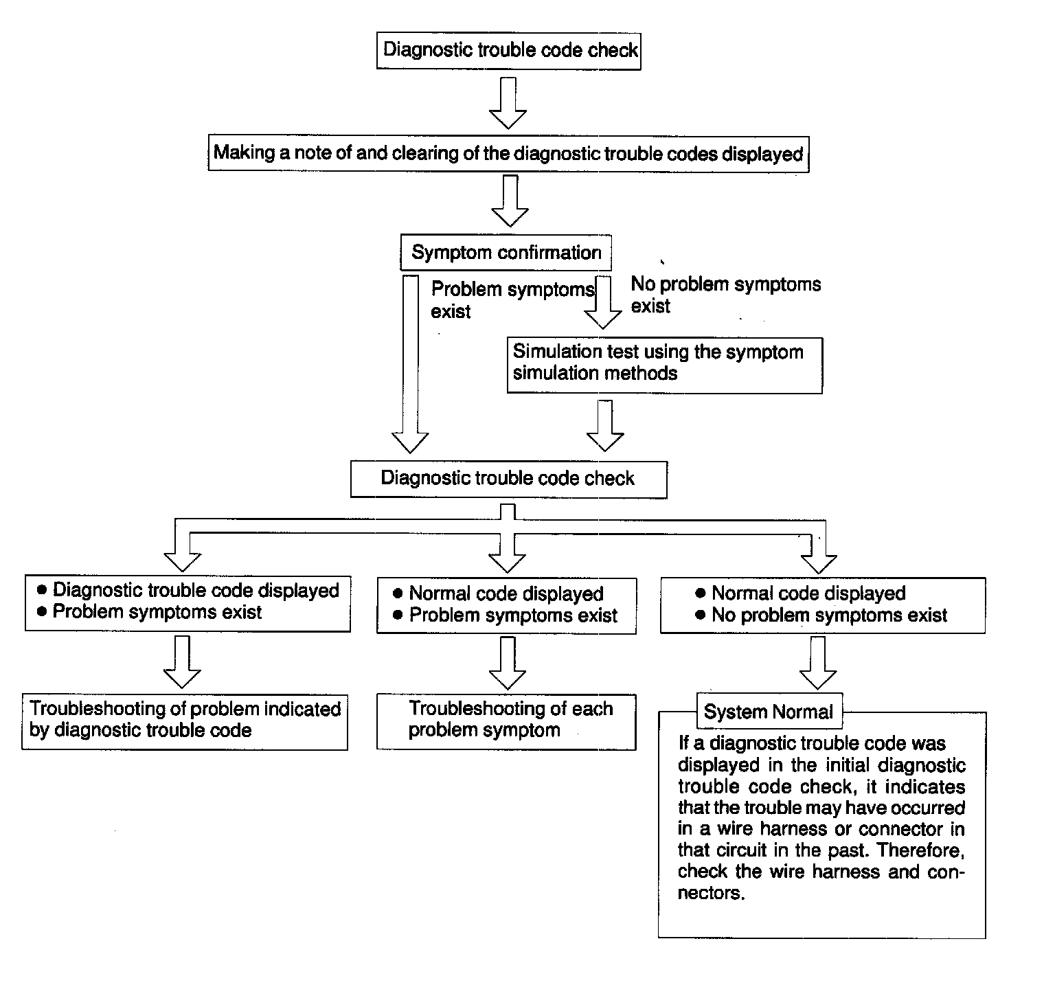 Taking into account the above points, a flow chart showing how to proceed with troubleshooting using the diagnostic trouble code check is shown. This flow chart shows how to utilize the diagnostic trouble code check effectively, then by carefully checking the results, indicates how to proceed either to diagnostic trouble code troubleshooting or to troubleshooting of problem symptoms table.