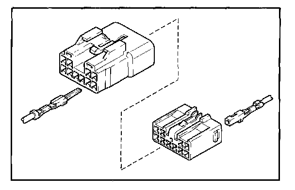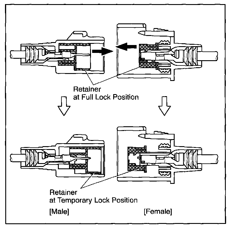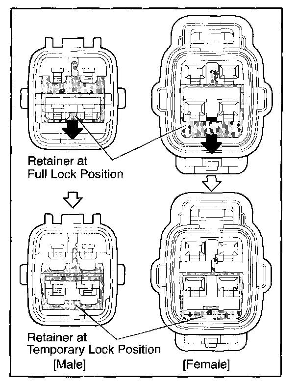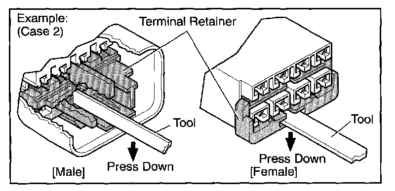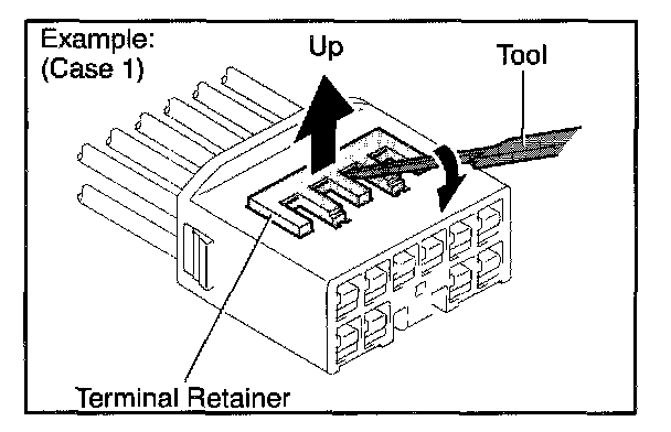 Insert the special tool into the terminal retainer access hole ("triangle" Mark) and pull the terminal retainer up to the temporary lock position.