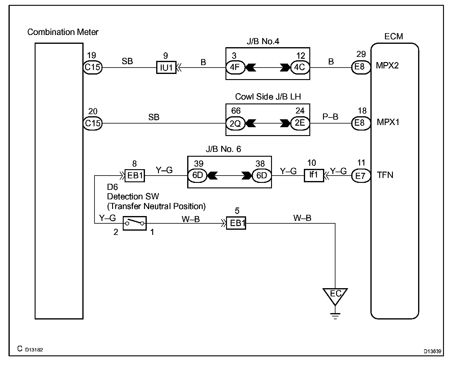 CIRCUIT DESCRIPTIONThe propeller shaft and wheels are free even when the transmission shift lever is set to P as long as the transfer shift lever is in Neutral position. The A/T. P. indicator light lights up to warn the driver that the propeller shaft and wheels are not locked.