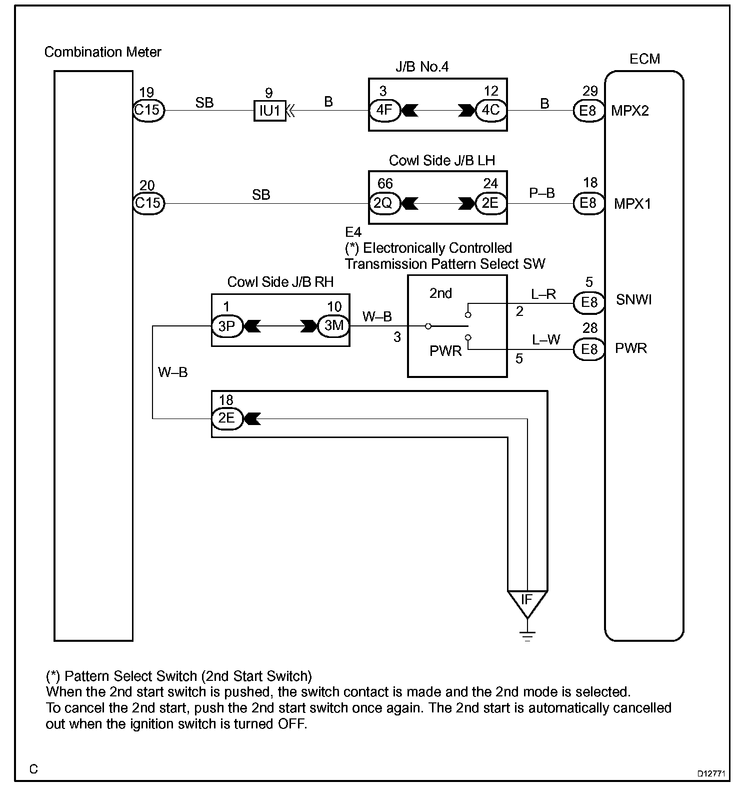 CIRCUIT DESCRIPTIONWhen 2nd start mode is selected with the pattern select switch, the ECM controls the solenoid valves and the transmission starts from 2nd gear.
