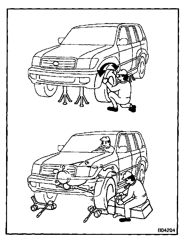 When doing on-vehicle wheel balancing on a full-time 4WD vehicle, to prevent each wheel from being rotated at different speed in different directions (which could damage the center differential), always be sure to observe the following precautions.