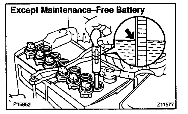 Except Maintenance-Free Battery: If under the lower level, add distilled water.
