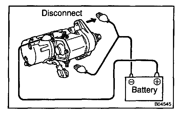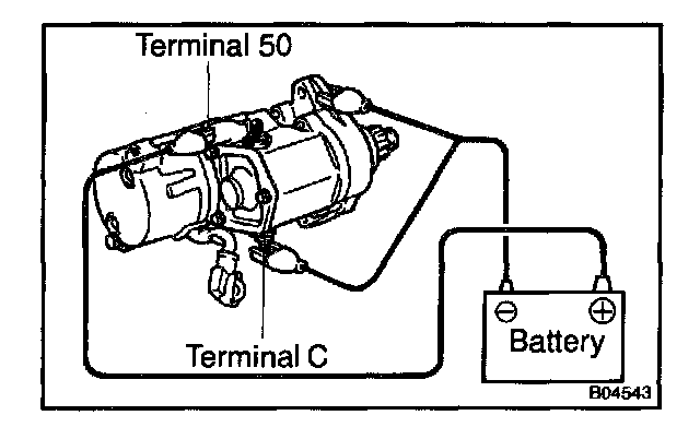 b. Connect the battery to the magnetic switch as shown. Check that the pinion gear moves outward.