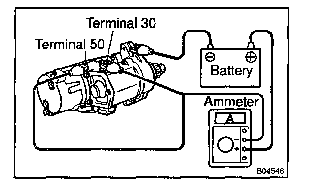 b. Check that the starter rotates smoothly and steadily with the pinion gear moving out. Check that the ammeter shows the specified current.